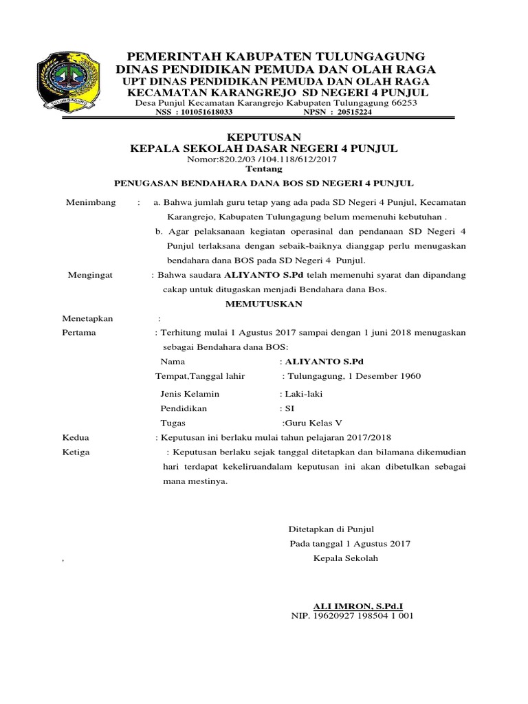 Contoh Surat Keputusan Bendahara Pengelola Dana Bantuan Operasional Sekolah BOS 2020-Terbaru. Contoh surat tugas bendahara bos sd. Permohonan pencairan dana bos tahap 1 ta 2021.